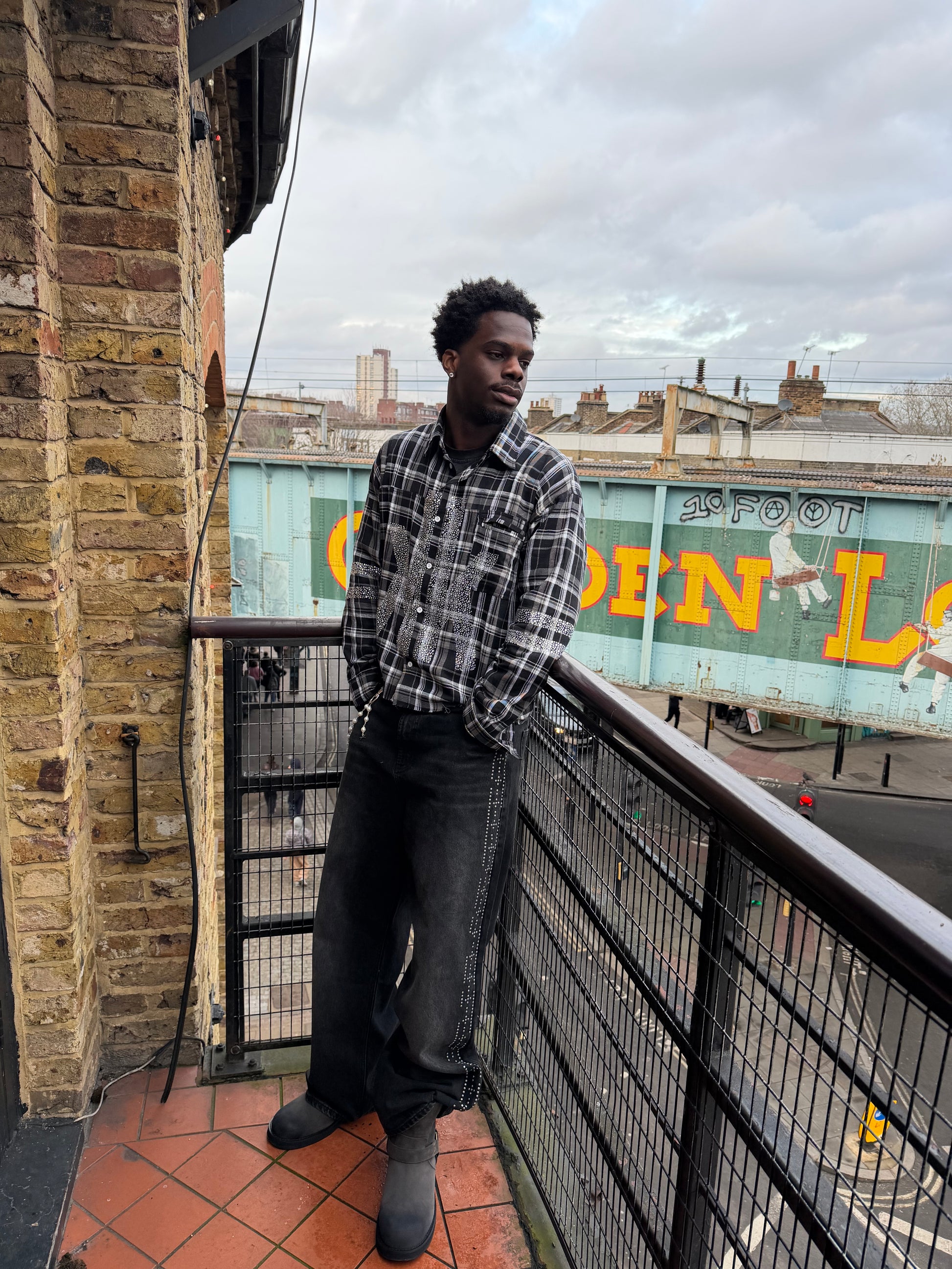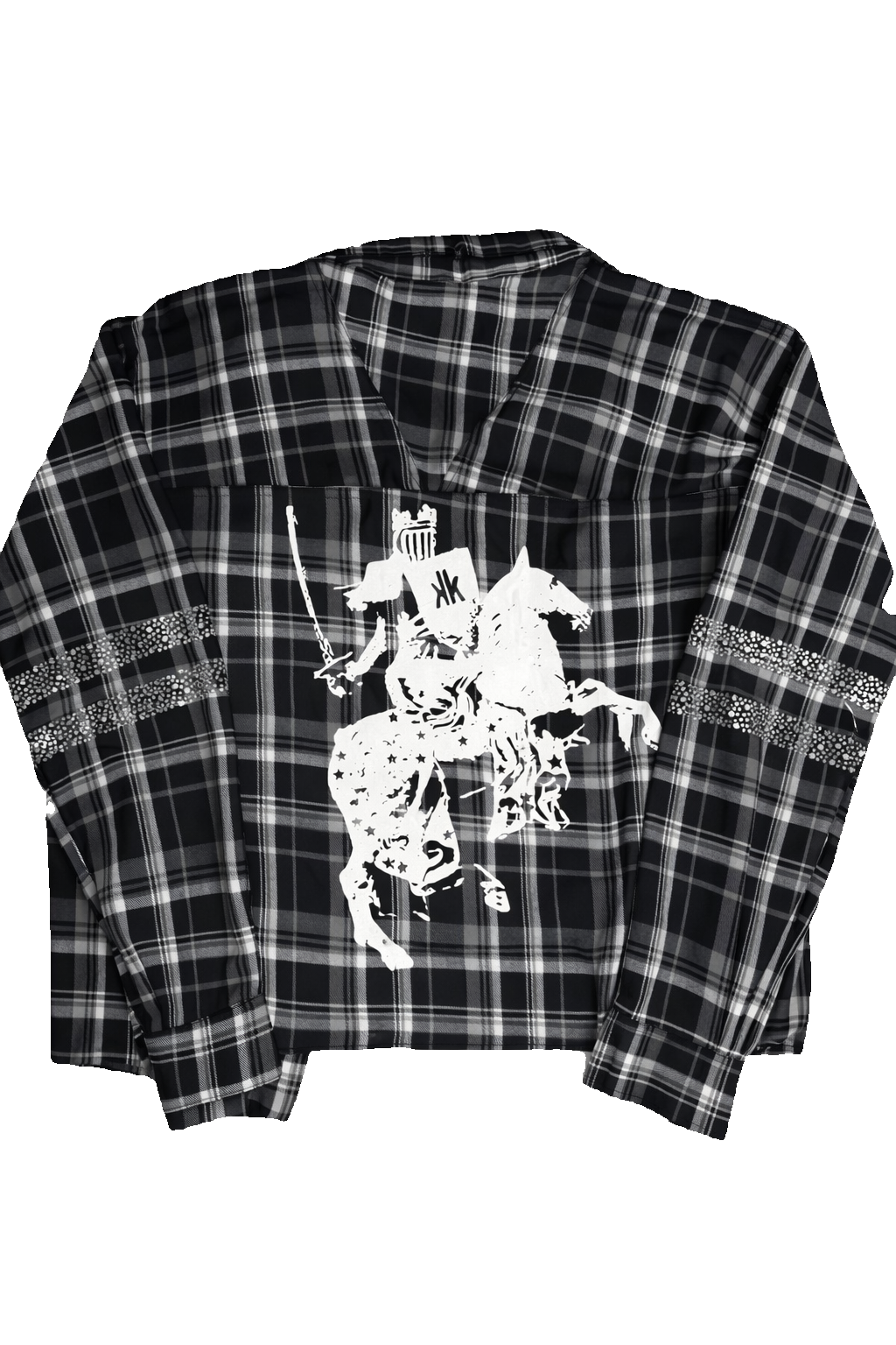 The KK Rhinestone Flannel features rhinestone detailing on the front and sleeves with the KK Knight screen printed on the back. With distressing and a slight crop fit.